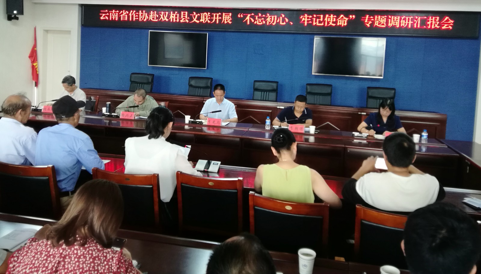 为深入学习贯彻习近平新时代中国特色社会主义思想和党的十九大精神,按照中央和省委关于开展“不忘初心、牢记使命”主题教育的部署,根据《云南省文联“不忘初心、牢记使命”主题教育调研工作方案》安排,7 月18 日下午,云南省作协副秘书长李朝德、云南省作协《边疆》副主编徐兴正在楚雄州文联党组书记、主席、州作协主席李光彪、楚雄州文联党组成员、兼职副主席、州作协副主席张永祥的陪同下,到双柏县文联开展调研,并在县委县政府六楼会议室召开调研汇报会。会议由人大常委会副主任苏燕主持,双柏县文联的全体干部职工、县内的文学爱好者52人参加了会议。