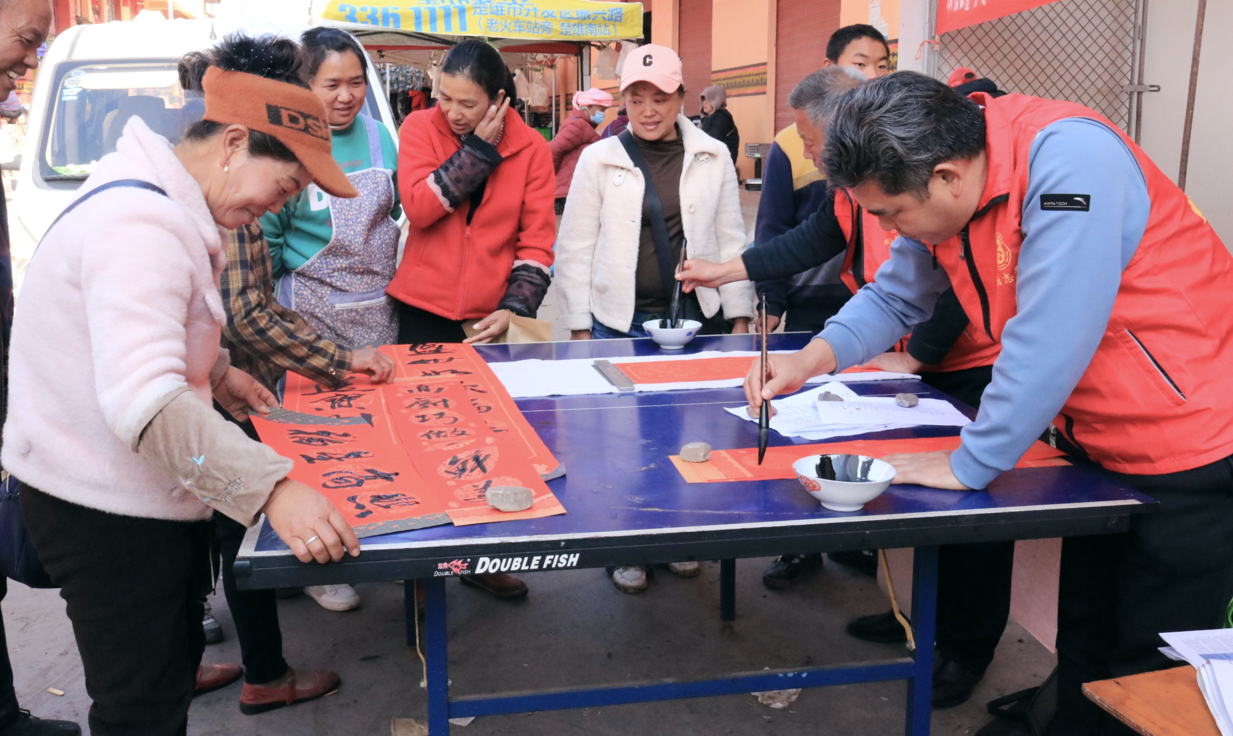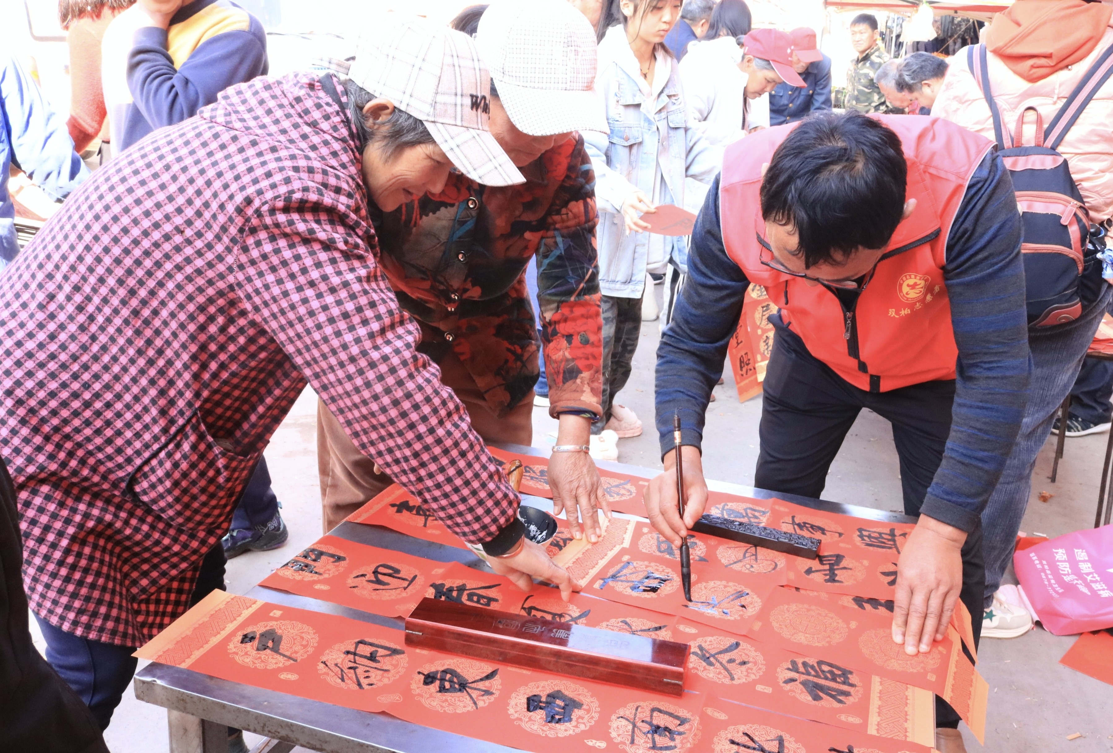 “老师们这个字写得是真好,太漂亮咯。”赶集的居民们拿着一副副红火的春联和“福”字,收获了今年的第一波“年货”,脸上洋溢着喜悦之情。