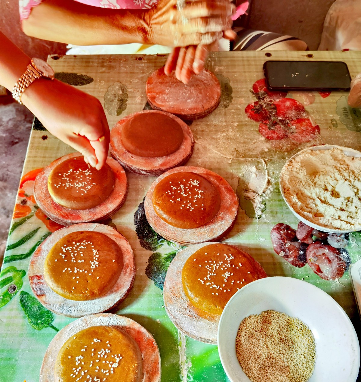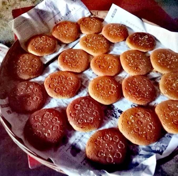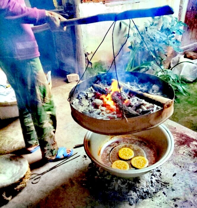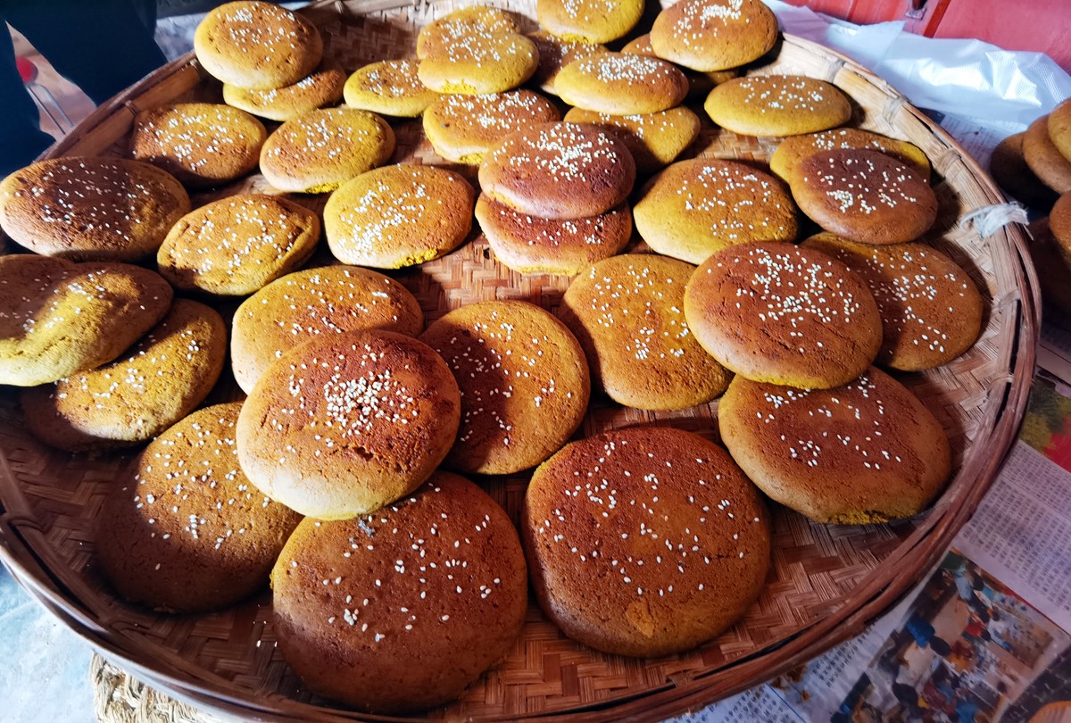底土粑粑是底土大村流传已久的特色食品,属于手工月饼,相传已有一百多年的历史。每年中秋节临近之时,家家户户都会亲手做底土粑粑。以小麦粉、苦荞粉、红糖、香油等为主要原料,有的还会配以花椒粉、草果粉、茴香籽粉等香料糅合发酵,将发酵好的面团过称,均匀分成面剂子,在特制的圆木板上按压成圆形面饼,在饼上刷上红糖糖浆,撒上一层白芝麻。因为没有烤箱,彝民们将面饼放在自家的铝制盆中,经过上下两层炭火慢慢烤制。在工序的最后,迎来的是等待的时间,只需二十分钟,金黄的面饼跃然眼前,扑鼻的香味随之而来,尝上一口,正是家乡的味道,承载的也是对家乡满满的记忆。