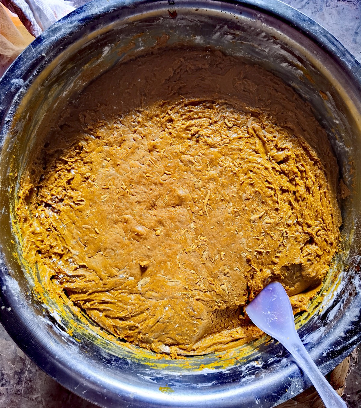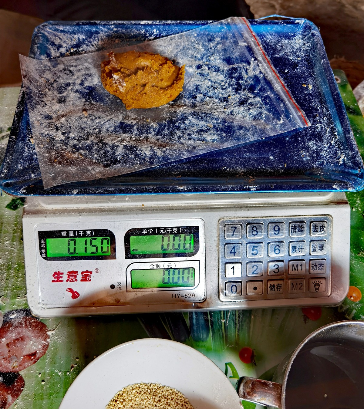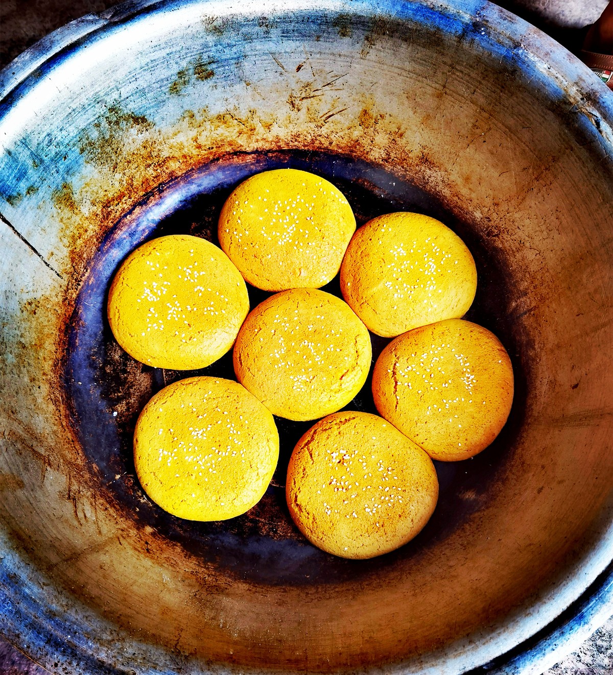 底土粑粑是底土大村流传已久的特色食品,属于手工月饼,相传已有一百多年的历史。每年中秋节临近之时,家家户户都会亲手做底土粑粑。以小麦粉、苦荞粉、红糖、香油等为主要原料,有的还会配以花椒粉、草果粉、茴香籽粉等香料糅合发酵,将发酵好的面团过称,均匀分成面剂子,在特制的圆木板上按压成圆形面饼,在饼上刷上红糖糖浆,撒上一层白芝麻。因为没有烤箱,彝民们将面饼放在自家的铝制盆中,经过上下两层炭火慢慢烤制。在工序的最后,迎来的是等待的时间,只需二十分钟,金黄的面饼跃然眼前,扑鼻的香味随之而来,尝上一口,正是家乡的味道,承载的也是对家乡满满的记忆。