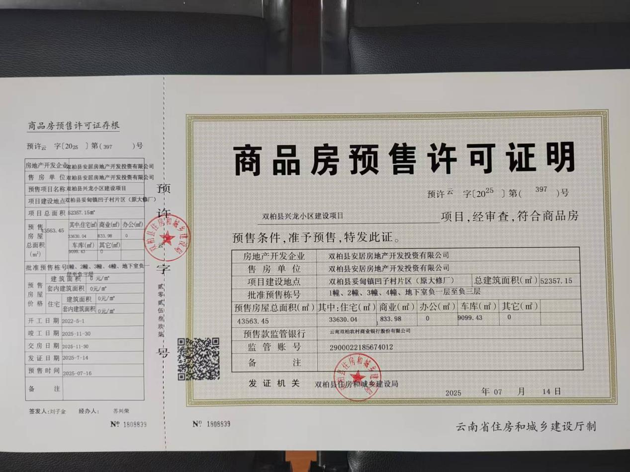 双柏县兴龙小区建设项目,位于楚雄州双柏县城查姆大道街心花园,开发建设单位为:双柏县安居房地产开发投资有限公司,企业法定代表人苏贤厚,企业统一社会信用代码为:91532322MA6K7X8PXM ,房地产开发资质证书编号为:云建房证开字〔2025〕311号。该项目土地使用权证书编号为:云(2023)双柏县不动产权第0001650号,建设用地规划许可证编号为:地字第532322202300003号,建设工程规划许可证编号为:建字第双柏县202400011号,建筑工程施工许可证编号为:532322202504280101。经双柏县住房和城乡建设局现场核实,该楼幢符合办理商品房预售许可条件,我局已于2025年7月14日在系统中受理接件并打印《商品房预售许可证明》,预售许可证编号为:预许云字〔2025〕第(397)号,此次批准预售范围为兴龙小区建设项目1幢-4幢及地下可售停车位,预售面积43563.45㎡,其中:住宅264 套共33630.04㎡,商业8 间共833.98㎡,停车位 202 个 9099.43㎡。预售部分资料齐全、手续齐备,具备预售条件。预售款监管银行:云南双柏农村商业银行股份有限公司,监管账号:2900022185674012。