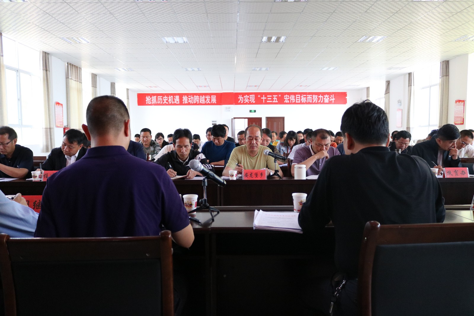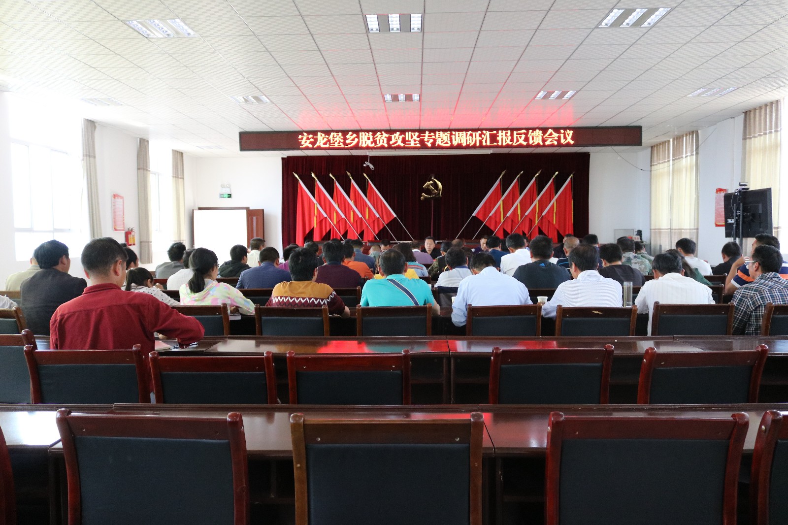 实地调研结束后,全体人员集中到乡人民政府大会议室召开安龙堡乡脱贫攻坚专题调研汇报反馈会议。安龙堡乡党政班子成员、脱贫攻坚观察员、部分县级挂包联系单位领导、8个村(社区)党总支书记、主任、第一书记,乡机关站所长共60余人参加了此次会议。