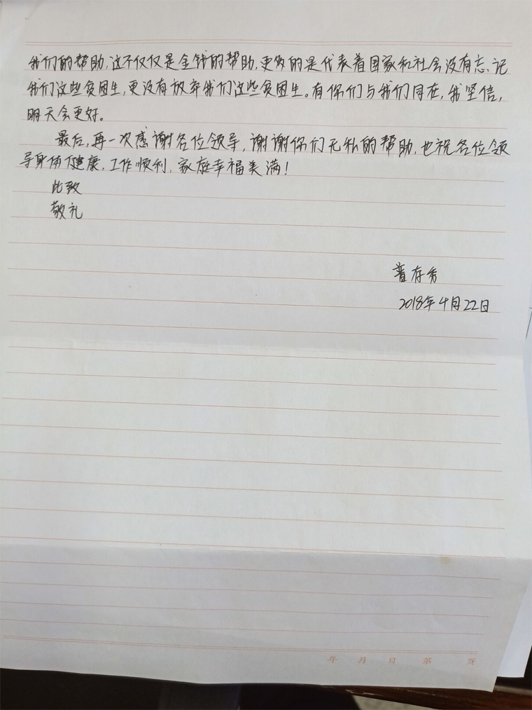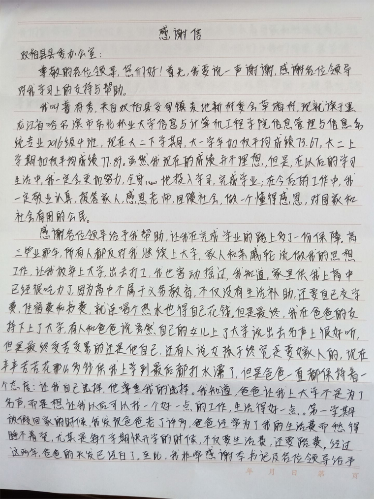 “我非常感谢李书记及各位领导给予我们的帮助,这不仅仅是金钱的帮助,更多的是代表着国家和社会没有忘记我们这些贫困生,更没有放弃我们这些贫困生。有你们与我们同在,我坚信,明天会更好…”5月5日下午,中共双柏县委办公室收到了哈尔滨市东北林业大学大二学生普存秀的来信。