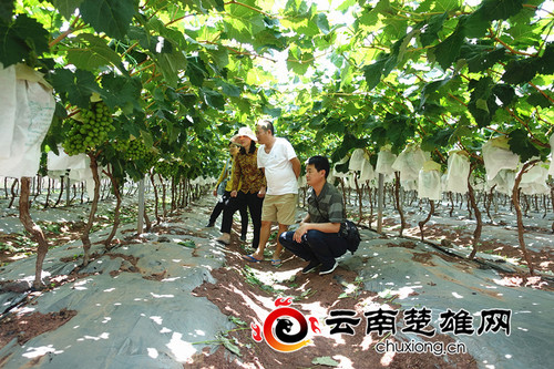 阳光玫瑰葡萄2015年由双柏县三江葡萄庄园有限公司引入大麦地镇绿汁江干热河谷地区的很本楷村进行试种,公司3年来通过采用设施促早栽培、避雨防雹棚行间及周围盖膜、水肥一体化等标准化管理技术示范已发展至200亩。