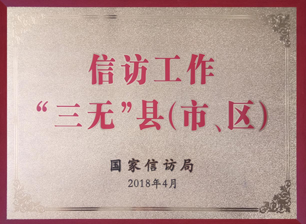 2017年、2018年连续两年荣获全国信访“三无”(无进京越级上访、无大规模集体上访、无因信访问题引发的极端恶性事件)县荣誉称号。