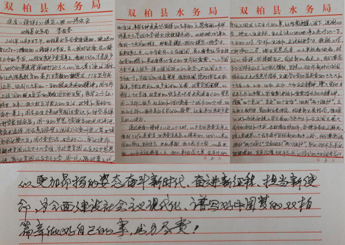 观看完《榜样6》节目后,水务局党员干部纷纷表示,“榜样的力量是无穷的,今后工作中要向“榜样”致敬,向“榜样”学习,沿着“榜样”的足迹前行,坚定理想信念,以更加务实的工作作风,切实推动水利工作发展。老党员李昌奇同志连夜写下了心得体会,他写到:看了《榜样6》节目,让我看到了什么才是共产党员,他们的事迹深深地打动人心,使我流出了泪水,我们要坚定沿着习近平总书记指引的方向阔步前进,谱写好中国梦的双柏篇章做好自己的事,出力尽责!