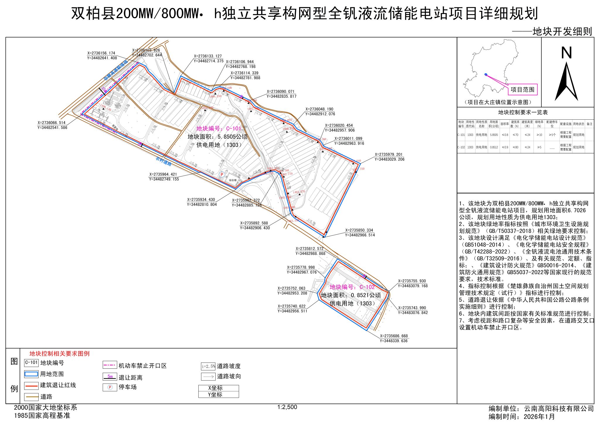 项目简介:根据《云南省国土空间详细规划编制导则(试行)》,针对双柏县200MW/800MW•h独立共享构网型全钒液流储能编制。本规划重点对地块的用地性质、用地面积、建筑系数、容积率、建筑限高、绿地率等内容提出引导性要求,本规划将作为后续控制土地批租、出让的依据。