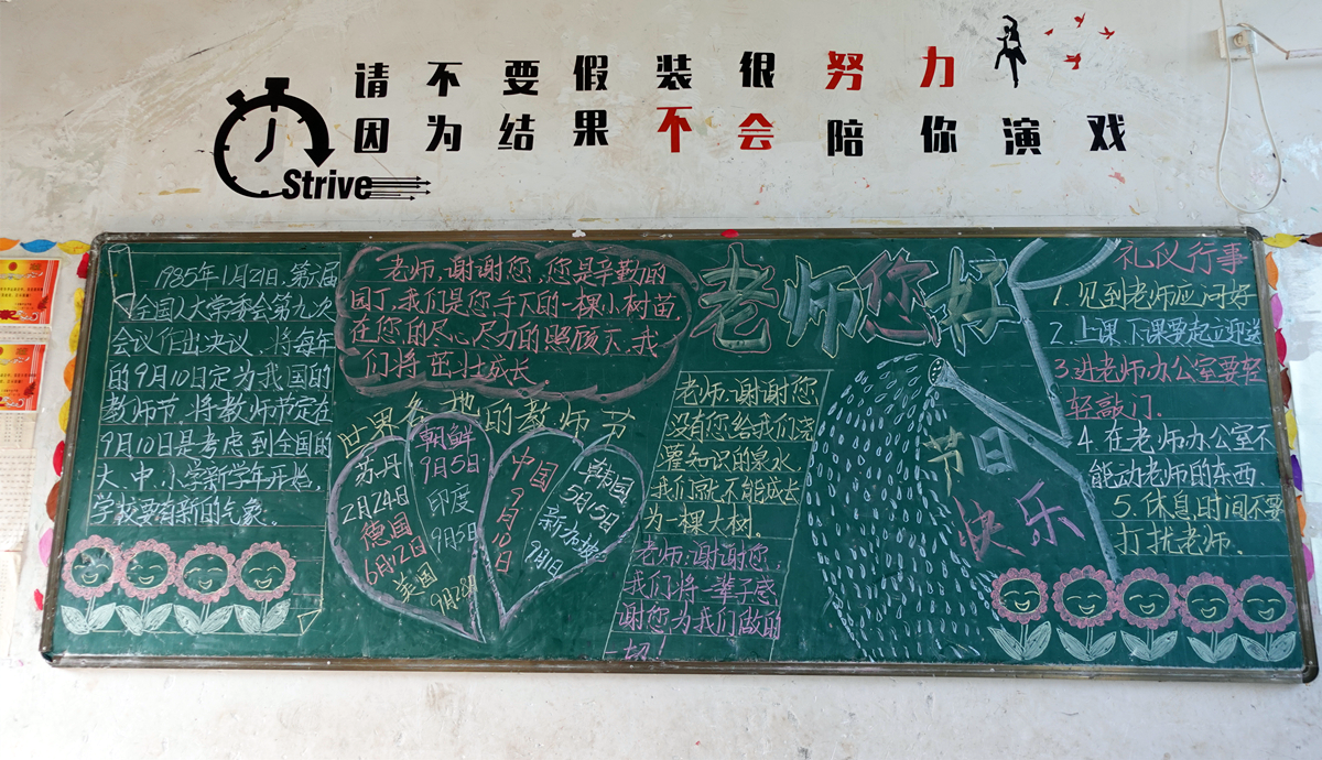 写下一句美好祝福。教师节到来之际,学生们以班级为单位,组织以“感谢师恩”为主题的黑板报创作,给老师们写一封信、一句真情的祝福、一声真挚的问候等,真诚地写下学生们对教师的感恩之心,从而更深刻的体会到教师的恩情,进一步端正学习态度,勤奋刻苦学习。