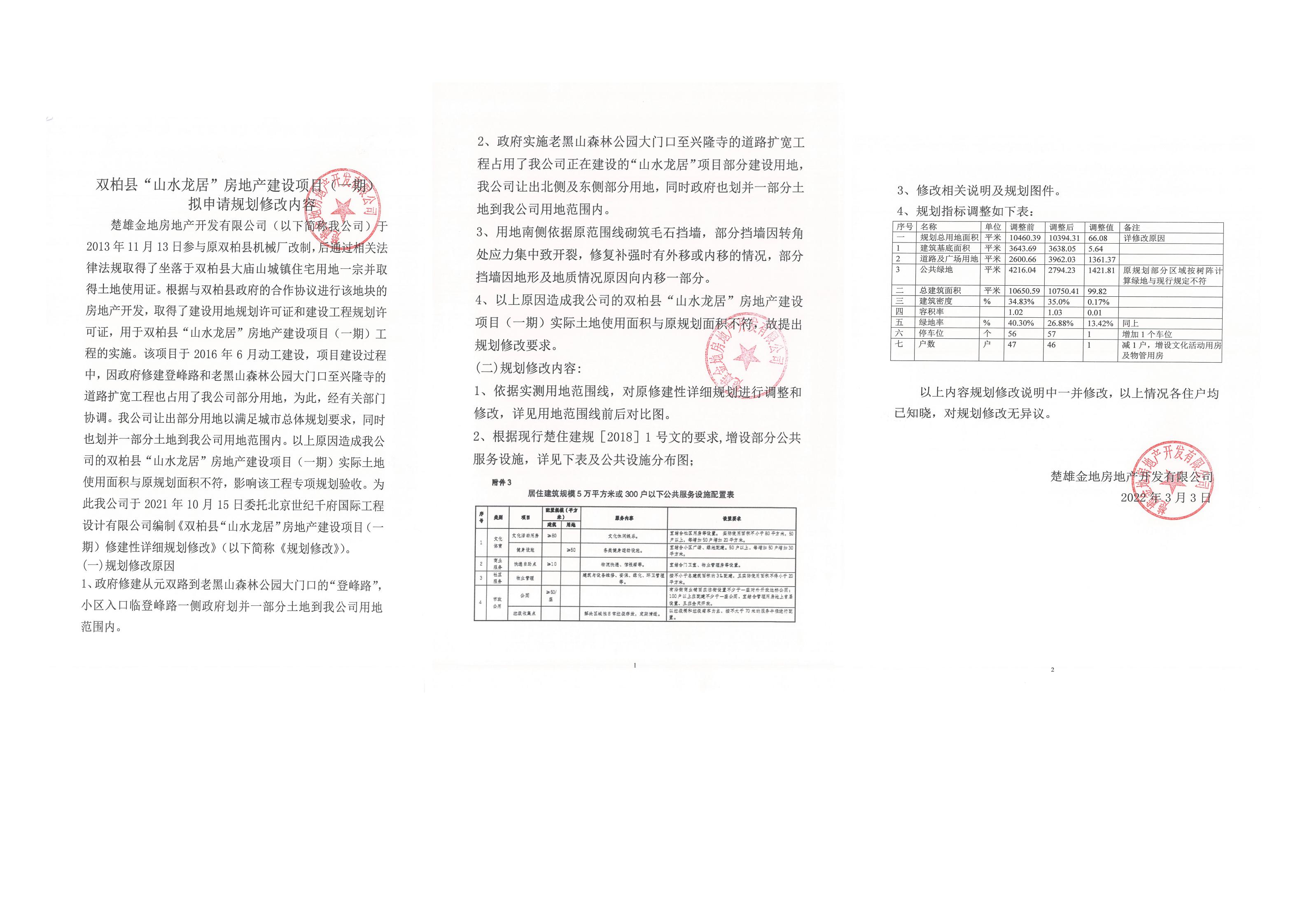 根据《楚雄州实施“阳光规划”的意见》,现对楚雄金地房地产开发有限责任公司双柏县山水龙居建设项目修建性详细规划修改进行修改前公示。社会各界人士若有意见和建议,请在公示期内向公示组织单位电话或者书面反映。